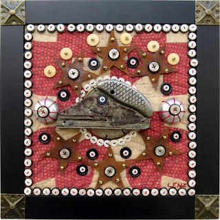 Lost and Found III. Custom picture framed: 18 1/2" x 18 1/2". Found objects hand-stitched to a section of a vintage quilt. Found objects include: a decorative, slotted serving spoon; a red, beaded coaster; eight, light blue insulin lancets; blue and yellow, plastic napkin rings; keys; vintage capacitors; eleven, pink ladybugs that were once a decorative part of a set of shower curtains; two, clear tape discs; three different brands of beer caps; two small clothespins; two thimbles; garter hooks; gold hooks and eyes; rectangular brass metal pieces; beads and buttons. Click on either image to enlarge.